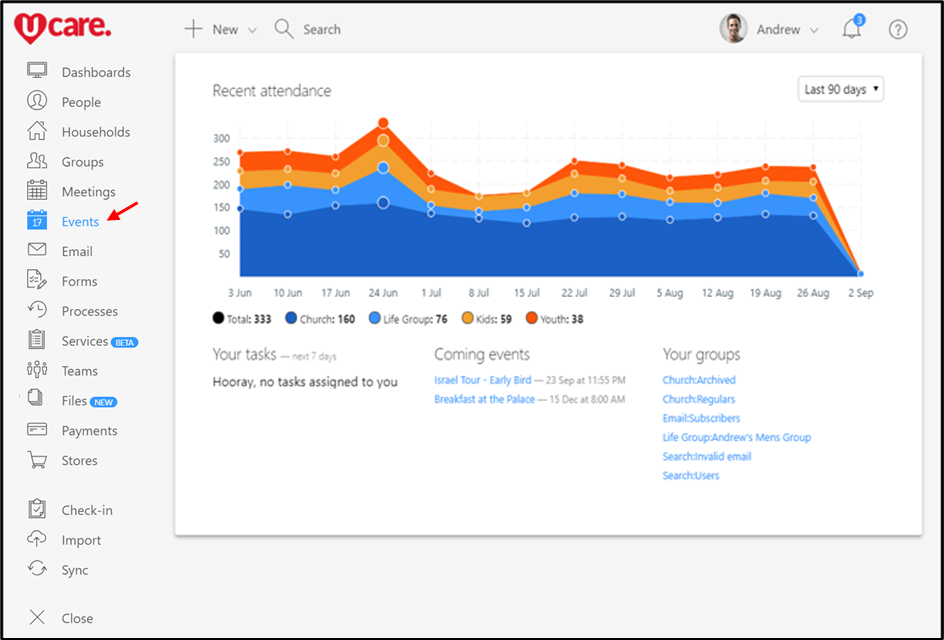 Events in UCare allow you to manage ticketing for events of any size. UCare processes payments and helps you keep in contact with event attendees via SMS or email. Adding an event list and booking forms to your website simplifies publishing new events. UCare lets you use smartphones to scan tickets, check in kids and attendees, and track attendance.