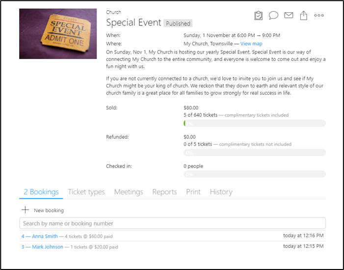 For people to book tickets to an event, the event needs to have one or more ticket types. You can add ticket types by tapping the “New ticket type” button on the Ticket Types tab. The Ticket Types tab also shows the number of tickets allocated for each ticket type.